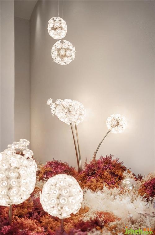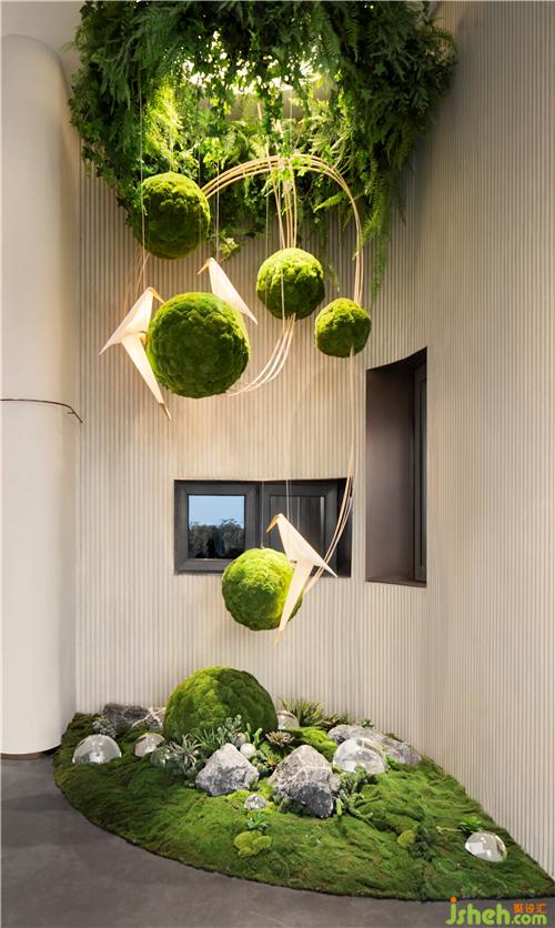 穿過過道展開生活新篇章,植物圓球裝置以跳躍的色彩與生活共舞,簡(jiǎn)約的空間中孕育著自然詩意,傳達(dá)未來生活的自然和諧與美好。