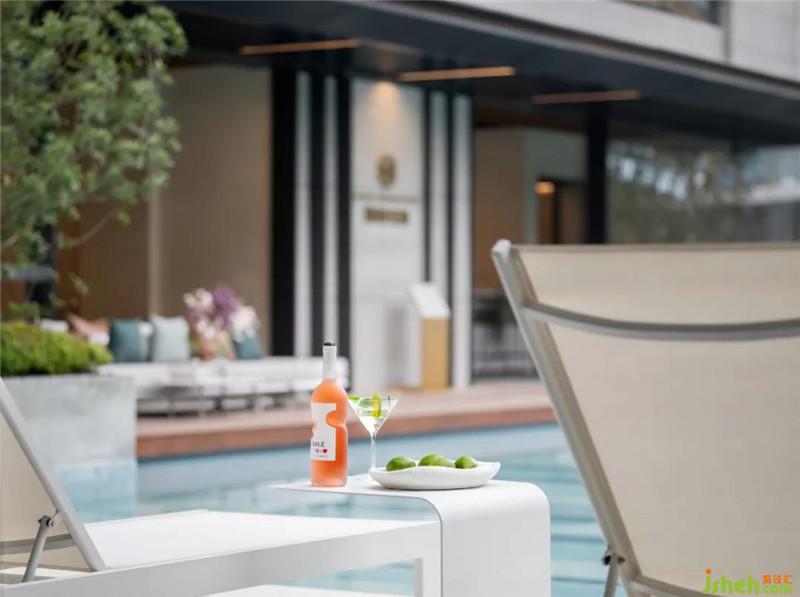 環(huán)繞水畔客廳布置親水平臺、休閑躺椅區(qū)、趣味互動水景區(qū),聯(lián)動架空層泳池配套區(qū)形成開放包容水畔客廳。色彩遵循極簡明快的搭配理念,賦予空間生活場域感與度假活力。