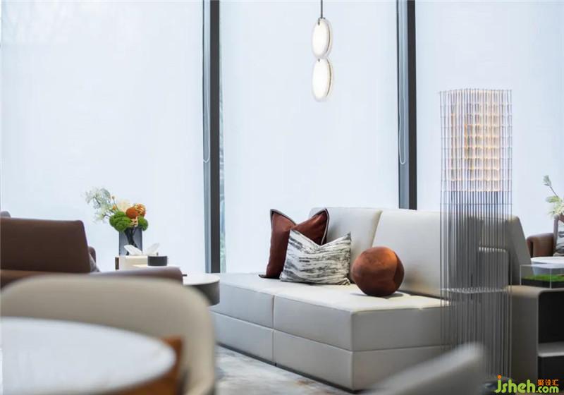 大面的落地窗戶將室外自然水景最大引入,在光線的折射下構筑自然與室內、與人之間的觀感互動。