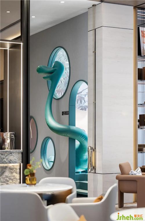 兒童區(qū)以趣味的恐龍世界,為都市的繁忙之余開辟一絲溫暖與童趣;回應東原人文關懷.趣味的人機互動增加了人與空間的交互,情景化的打造讓這般簡單的童趣互動在此形成了景中景,還原孩子童真的一面深圳售樓處設計。