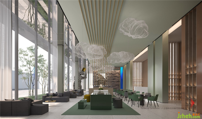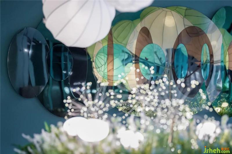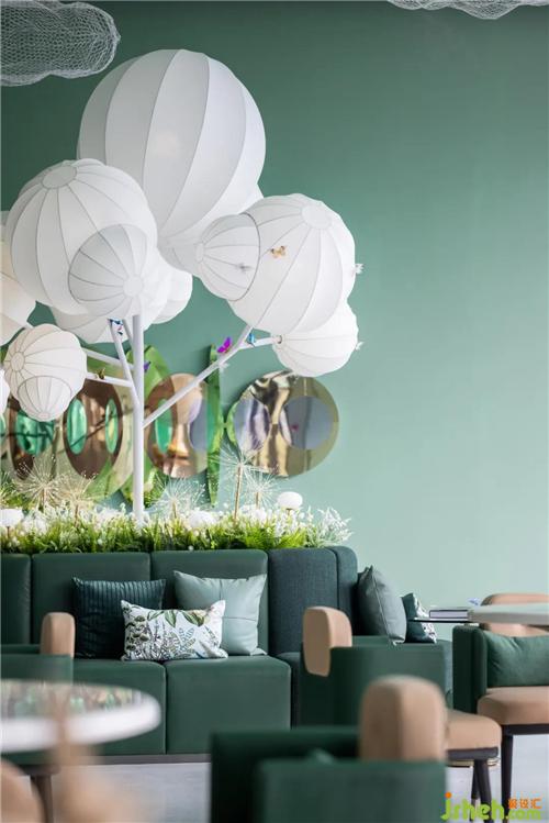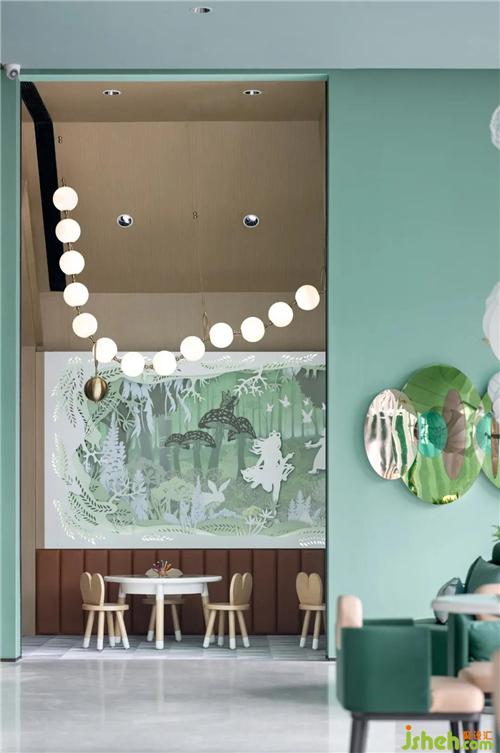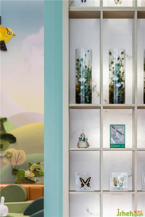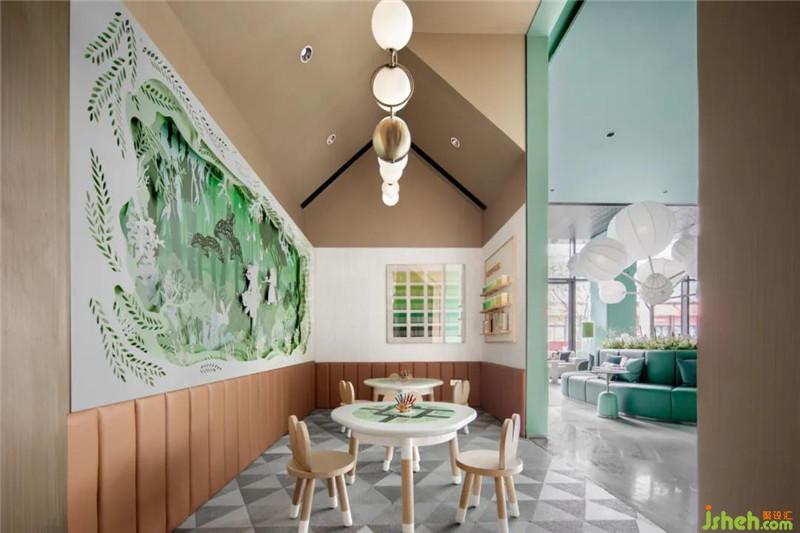 設計提取生態(tài)綠意,以溫暖的藝術(shù)漆結(jié)合彩繪的透明裝置,為空間增加了靈氣、呼應了當?shù)乜腿簩γ篮蒙畹你裤脚c向往。深圳售樓處設計童話世界從不只屬于兒童,更是為城市奮斗打拼一族呈現(xiàn)了追尋的詩與遠方。