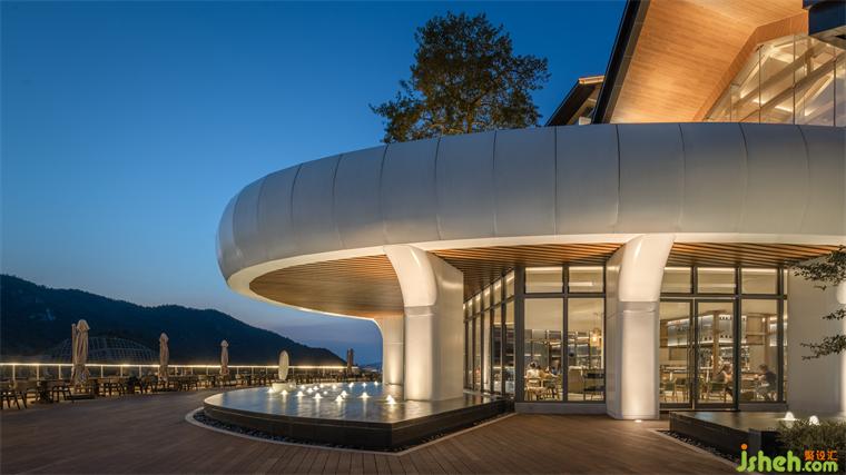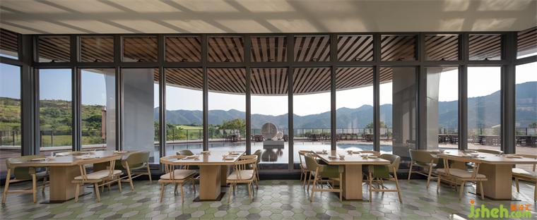 餐廳外,巨大的視野與山脈相連,自然萬物都靜靜等候著,等著觀者去觀察、去游歷。酒店設(shè)計一組軸對稱的榫卯藝術(shù)品,立于山脈視線中心,將空間由內(nèi)向外引至遠方。