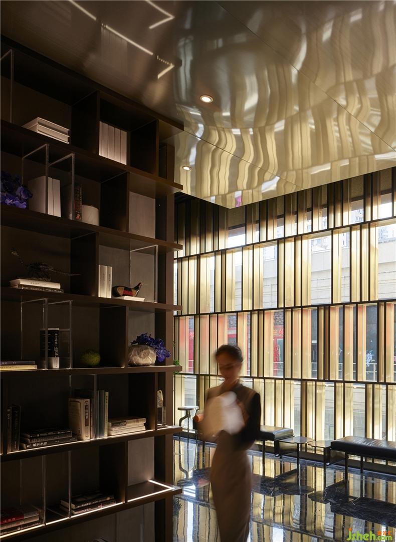 古銅色書架與落單臺呼應(yīng),同時作為兼具空間轉(zhuǎn)換的物件,區(qū)分開大堂/半包空間與包廂區(qū)域,兼?zhèn)鋵嵱门c美學(xué)的功能。