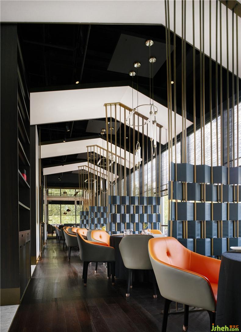 古銅色藝術(shù)屏風(fēng)“猶抱琵琶半遮面”,一半金屬、一半布藝的材質(zhì)混搭,若有似無間逐一區(qū)隔每一個半包空間,一種曖昧感游離在私密與開放之間。