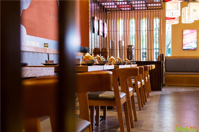 抬高就餐區(qū)墻面木格柵延伸至頂面,營造日式氛圍,浮世繪壁畫若隱若現(xiàn),增添幾分神秘,座位之間布簾增加私密感同時,布面筆觸為“弘秋居”偏旁部首,處處都在渲染弘秋居文化氛圍。