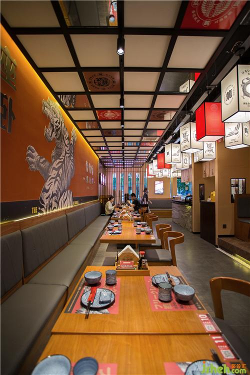 刺身區(qū)灰色墻磚和吧臺石皮俏皮不失端莊。入口就餐區(qū)背景墻運用鉆點紋不銹鋼作為載體背景,增添現(xiàn)代氣息,墻面點綴“龍鶴虎”燈箱,體現(xiàn)弘秋居文化。頂面潮流感的燈籠、吊旗掛飾,為空間增添氛圍。