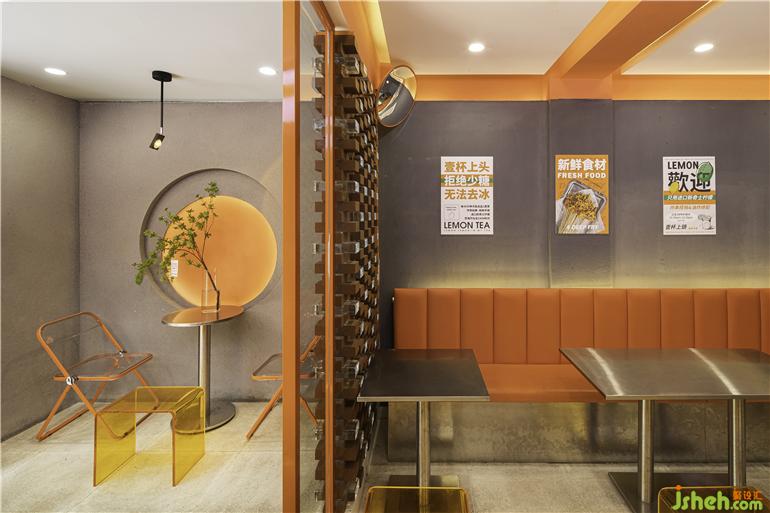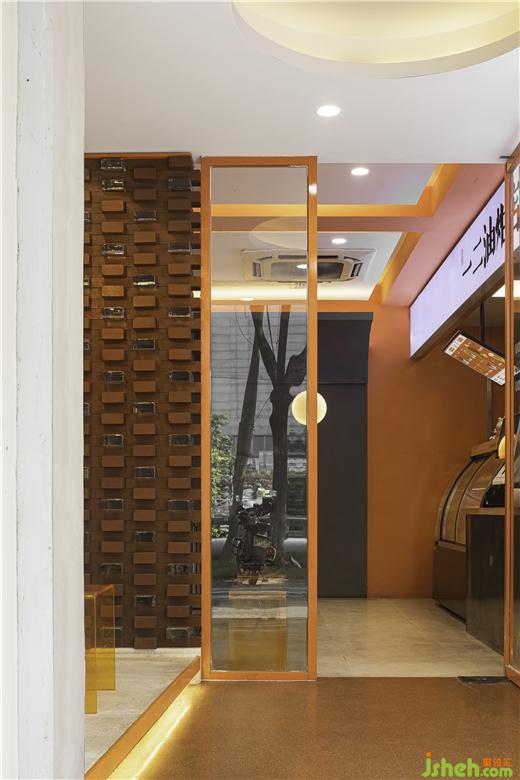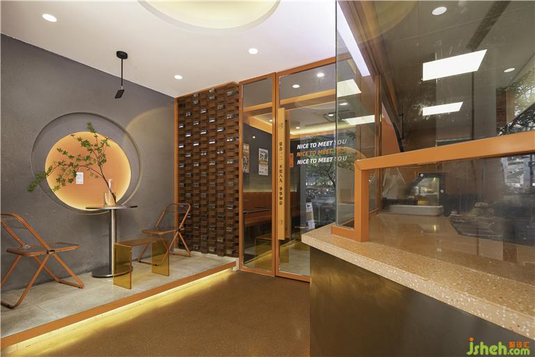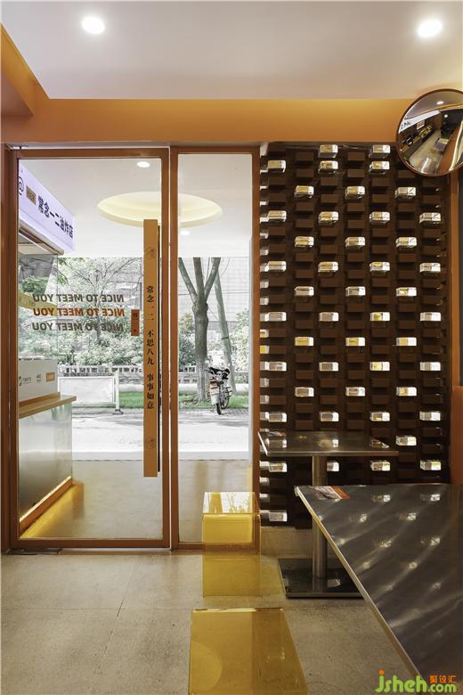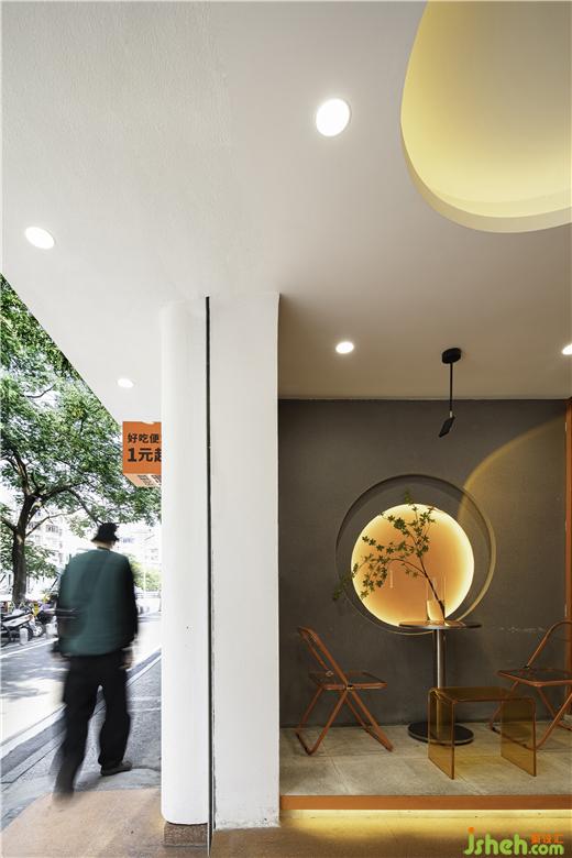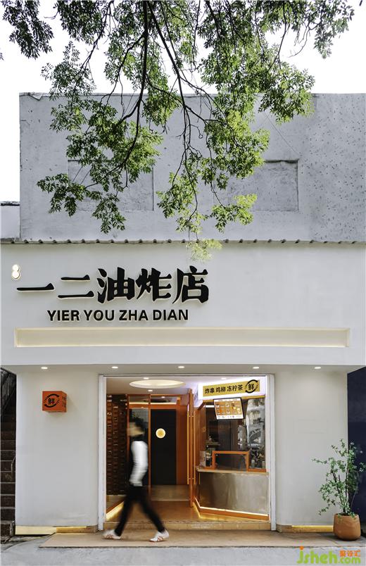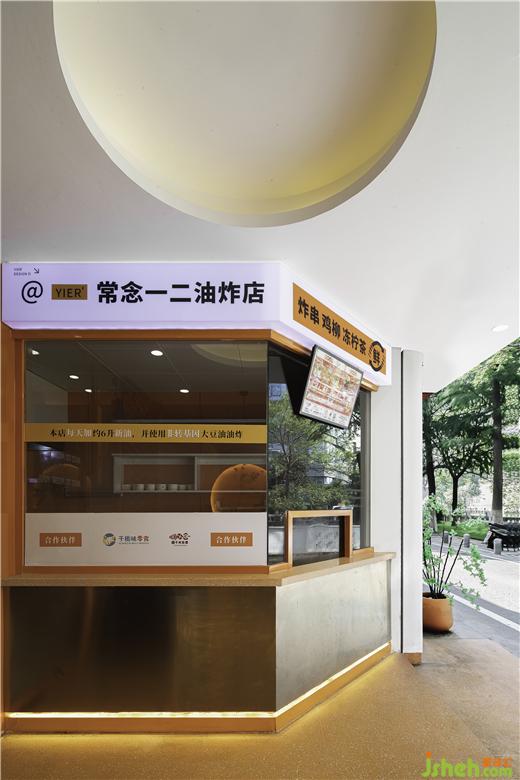 店鋪門頭外圍整體采用白色調(diào),門楣點(diǎn)綴暖黃色燈帶,簡約精致,門頭視線焦點(diǎn)的中心入口處則以火熱的橙色為主色調(diào),油炸店設(shè)計(jì)隱約的透露著室內(nèi)的一絲絲熱情煙火氣,就像《桃花源記》中的“林盡水源,便得一山,山有小口,仿佛若有光?!苯o人一種神秘感,有讓人走進(jìn)室內(nèi)看一看的欲望。