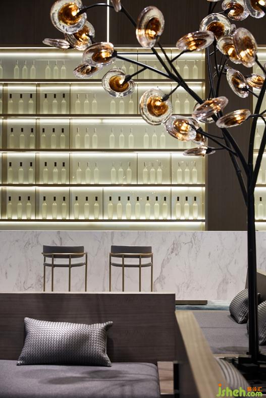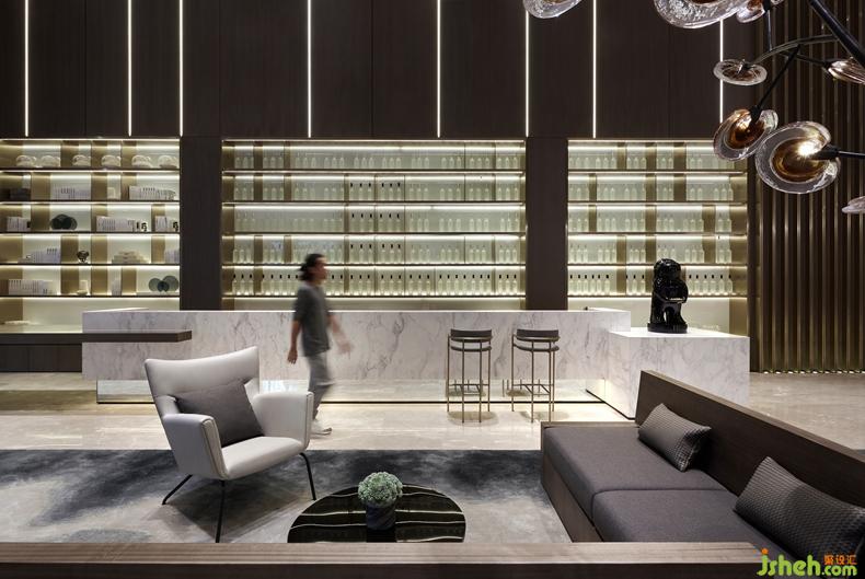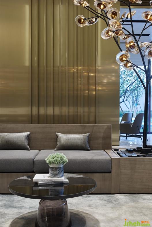 室內(nèi)空間通過(guò)時(shí)尚的藝術(shù)氛圍,傳達(dá)不一般的感受。擯棄多余的材質(zhì),空間中選用大面積的黃銅拉絲不銹鋼與木飾面相接,搭出極具視覺沖擊力的多元層次,完成空間的藝術(shù)化表達(dá)。同時(shí),用光影的營(yíng)造手法,帶來(lái)更多的時(shí)尚與科技的感受,完美的比例分割,做到多一分則多少一分則少的境界。