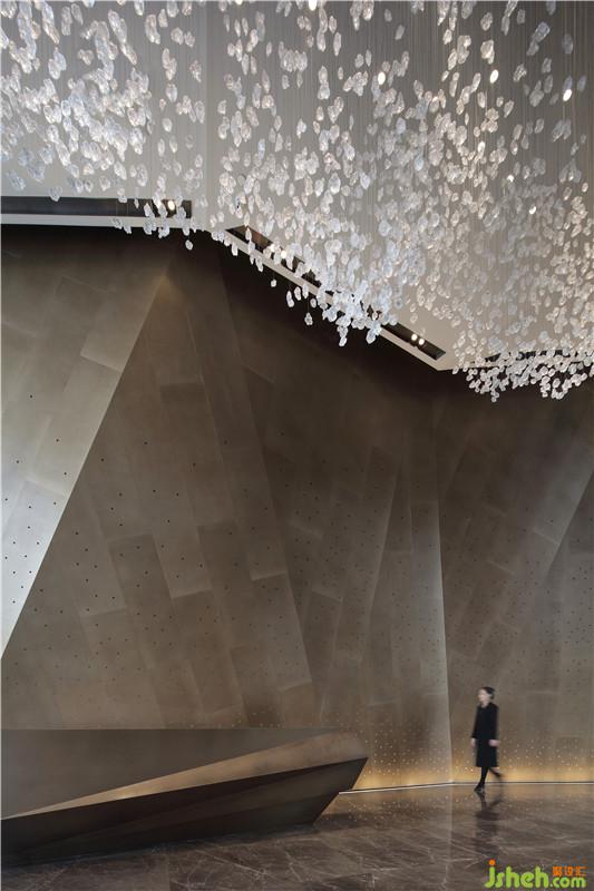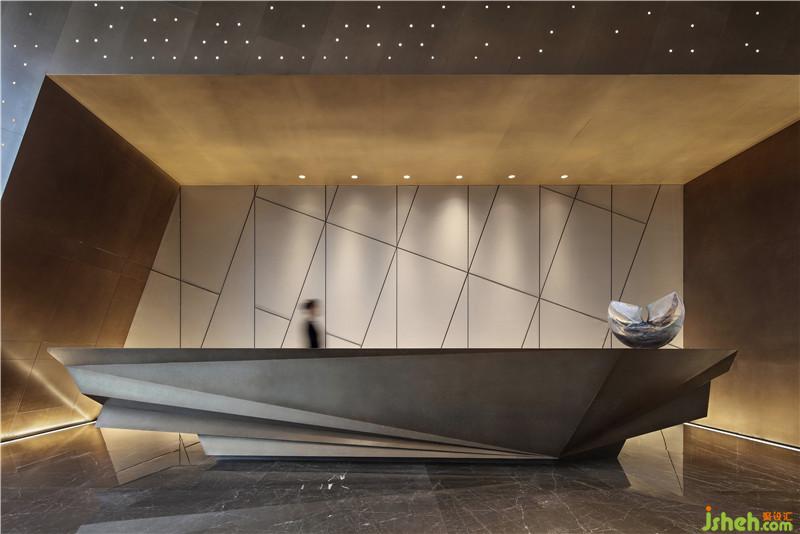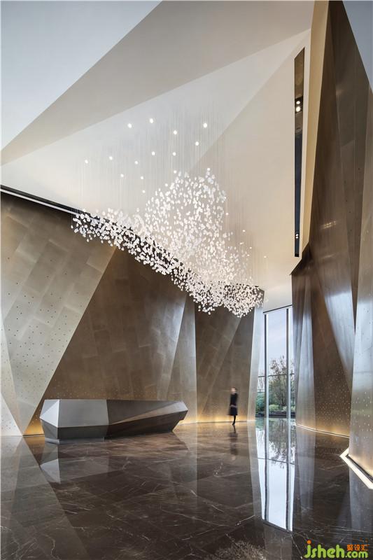 設(shè)計(jì)以精妙絕倫的造型展開,彰顯建筑與自然的融合新生,詮釋尊崇展廳的價(jià)值座標(biāo)。在極具深度的變化中營造空間序列,前廳的第一視感是形成整個空間氣質(zhì)的起點(diǎn),墻面與天花的立體折型設(shè)計(jì)和強(qiáng)烈造型感的空間結(jié)構(gòu),極具視覺沖擊力。光線從墻面穿孔鋁板透出,與山石吊飾造景形成獨(dú)特韻味,疏影斑駁靈動。摒棄多余的陳設(shè),以極具現(xiàn)代感的藝術(shù)裝置去迎合空間本身的靈動,搭出極具視覺沖擊力的多元層次,完成空間的藝術(shù)化表達(dá)。
