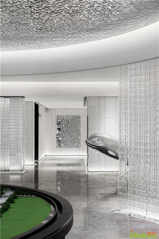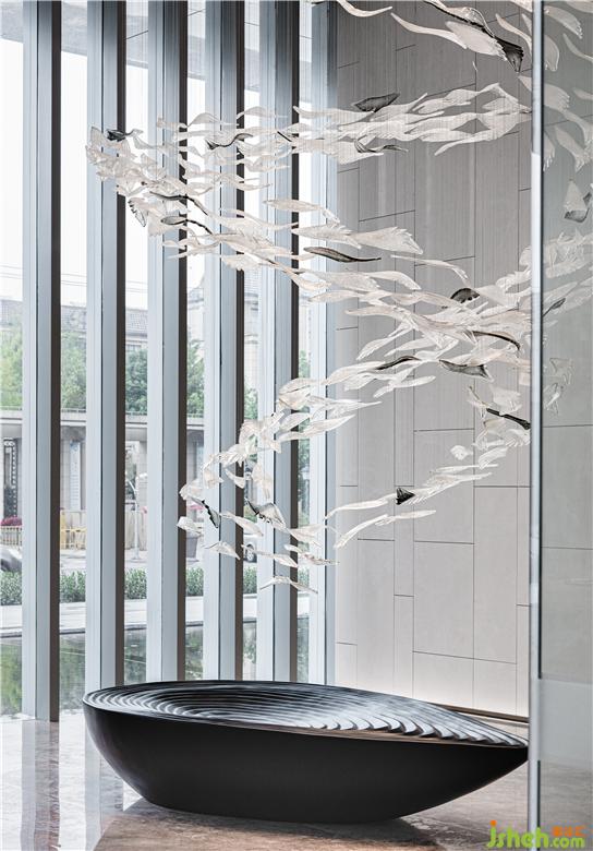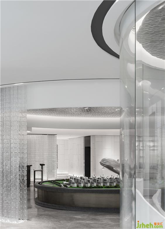 售樓處設計從上而下的藝術魚群裝置貫穿其中,使新老交匯,魚群裝置,輕盈流動,猶如置身海洋,讓藝術與人文對話,在萬物的自然中,是傳統(tǒng)與現(xiàn)代相融,風貌與未來的同在。