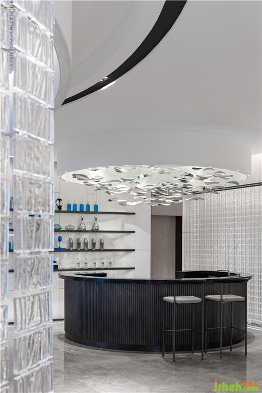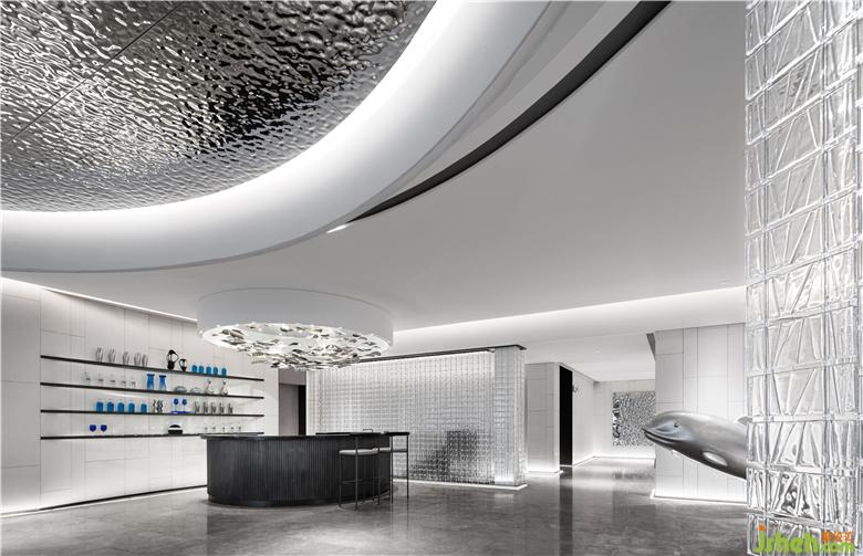 屋頂方面,通過對自然流水的模擬,利用鏡面波紋效果氣氛強調氣氛,將澄澈之色與水系縱橫的自然風景納入其中,動與靜互相映照,構成一幅綺麗的畫面。