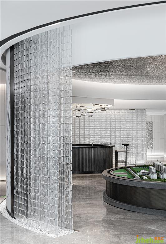 室內的動線是蜿蜒流動的,暖灰色大理石具有豐富自然肌理,售樓處設計大面積運用于空間中,玻璃磚格柵的環(huán)繞在展示沙盤周圍,如瀑布傾灑而下與金屬質感的相互點綴,為人們創(chuàng)造了高雅寧神的別致環(huán)境。