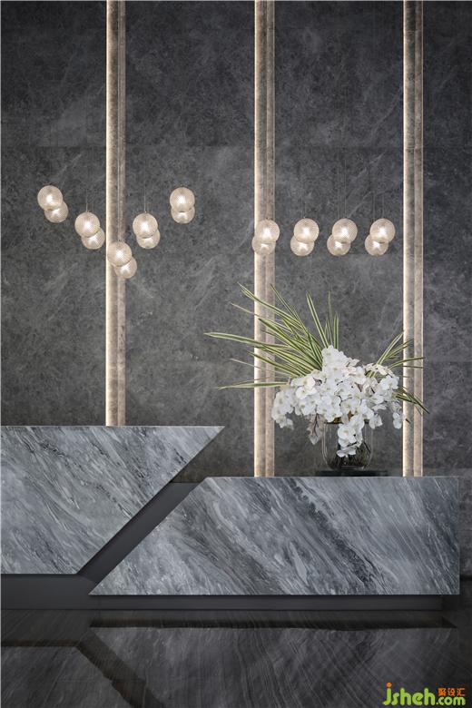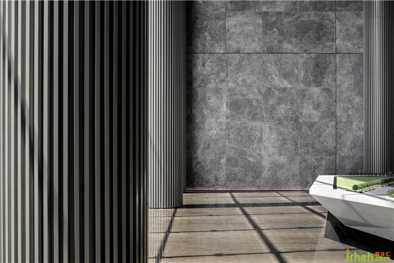 主要材料| 意大利灰皮革面石材、美國木紋大理石、藍(lán)金沙大理石、定制古銅不銹鋼造型板、鋁格柵板、染色柚木木飾面、杜邦可麗耐等