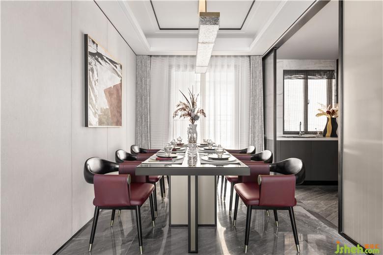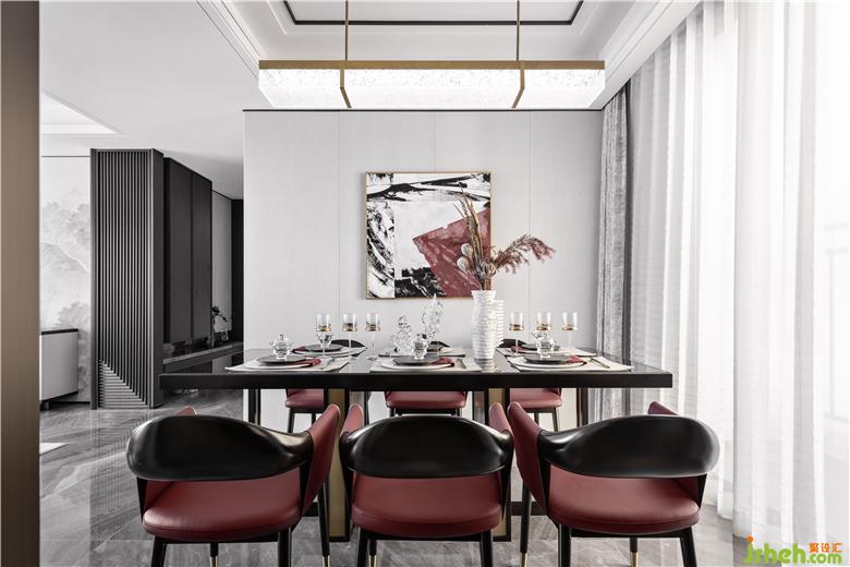 餐廳延續(xù)客廳配色以及材質,頂部燈具采用棋盤式意境形態(tài),心平氣和謙讓有度的大氣氛圍在此彌漫開來。