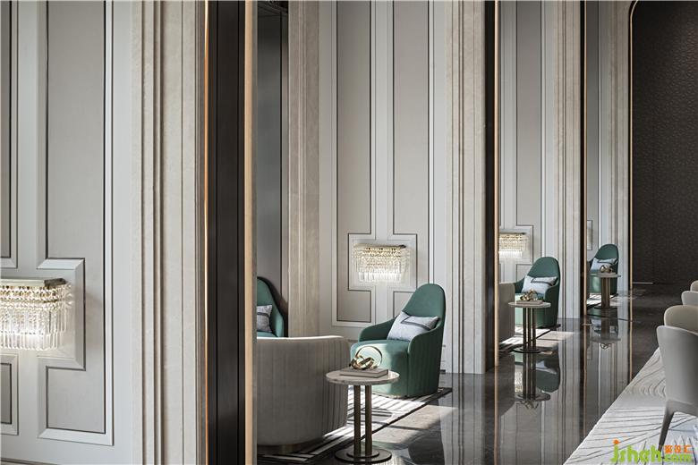 熠熠生輝的水晶吊燈,在光影流轉(zhuǎn)中灑下馥郁飽滿的色彩,潔凈又明麗。金屬裝飾與大理石的組合在特定的氛圍里,沉淪隱秘奢華的氣息,帶有微微的貴族感。