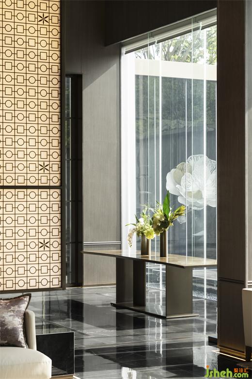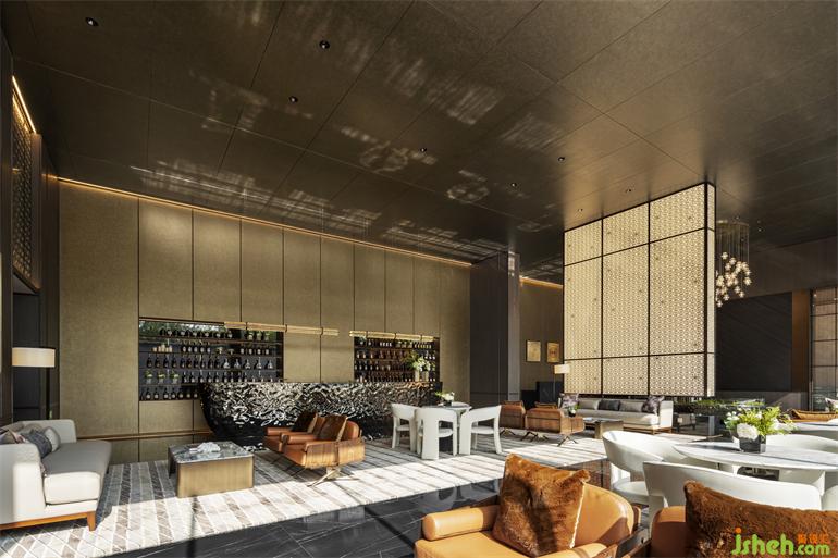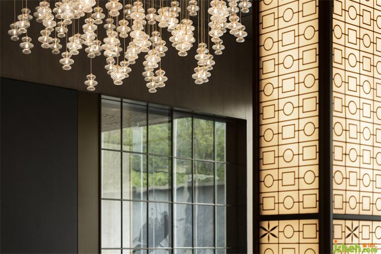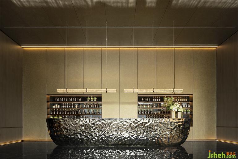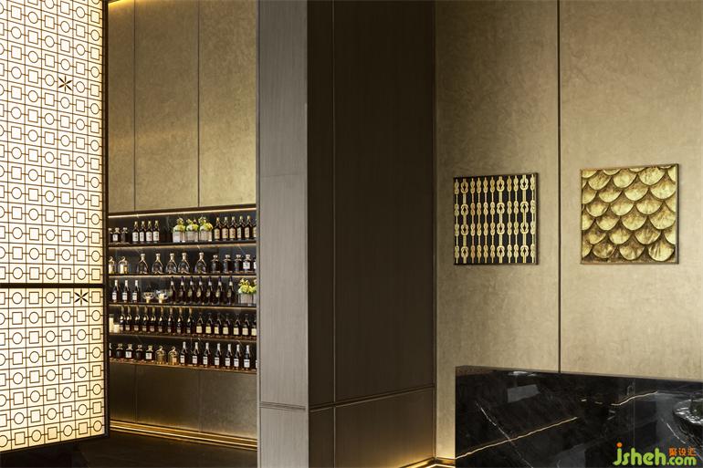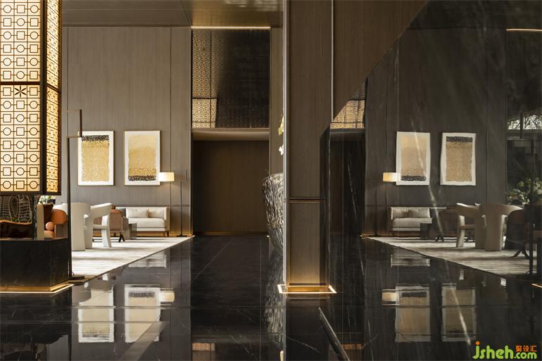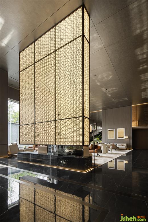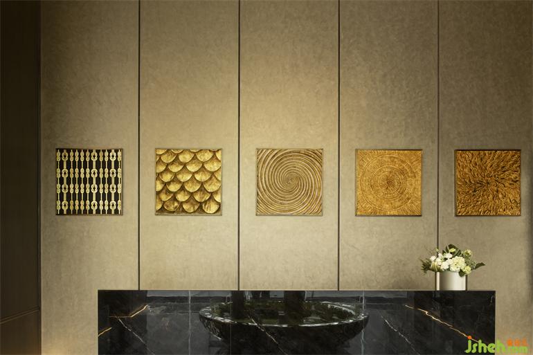 由寧波市市花山茶花演變而來的云石燈箱花紋,簡約的序列視覺感讓空間立體純粹,光線的擴散使氛圍增感強,平靜優(yōu)雅之余,亦多了一種光影和結(jié)構(gòu)的表現(xiàn)。售樓處設(shè)計在黑與金的加持下,純粹精致感映入場景內(nèi)核。