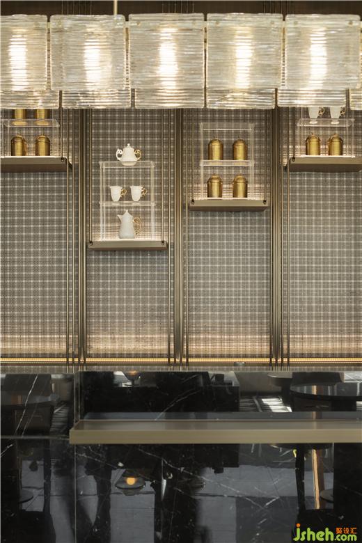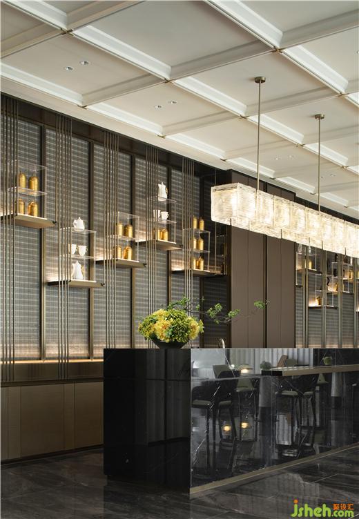水吧臺兼具酒店式服務(wù),臺面石材紋理飽滿,燈光與地面陰影的轉(zhuǎn)變、頂面裝置互動,三者明暗不一、動靜各異的變化,展示中心設(shè)計繪制出具象化的空間情緒。