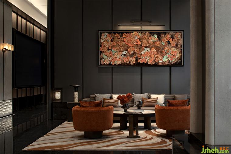墻面以“花”為題的藝術(shù)畫靜靜懸掛,以細(xì)膩的筆觸裝點(diǎn)空間,與周圍意境相得益彰。熱烈的橙色調(diào)猶如一抹絢爛光束,溫柔地灑落在江南古韻的街巷間。高飽和度色彩巧妙地引導(dǎo)著視線流轉(zhuǎn),層層遞進(jìn),強(qiáng)化空間的序列感與深度。