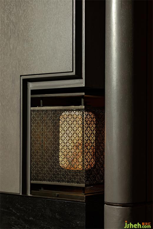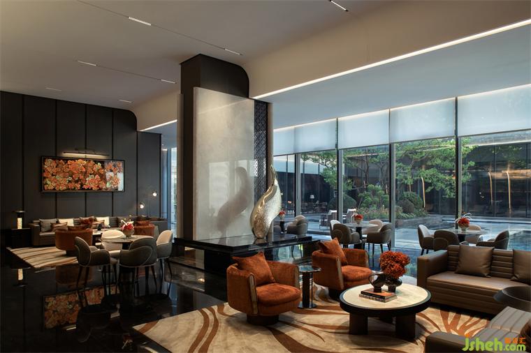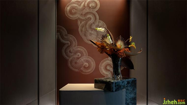 通高的空間尺度借鑒園林中的開闊與高遠(yuǎn),使空間顯得更加寬敞明亮,給人以無限遐想。水晶燈如月光傾灑而下,為大廳披上了一層神秘的銀紗,黑白的拼花地面又在光影的交錯(cuò)中凸顯空間層次和深度,與東方美學(xué)意境相得益彰。端景如園林中的亭臺(tái)以一種跨越時(shí)空的姿態(tài)成為空間焦點(diǎn),紅花的點(diǎn)綴增添了一絲不羈的靈動(dòng)。
