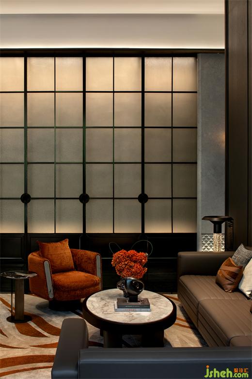 深色調(diào)的墻壁和天花圍合穩(wěn)定的框架,出靜謐而專注的沉浸式氛圍,簡約的垂直線條強(qiáng)化區(qū)域的縱深感和高度感,水平向線條平衡空間結(jié)構(gòu),共同透出穩(wěn)固有序的氛圍。