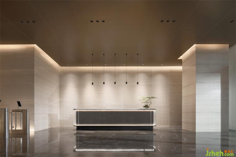 辦公接待區(qū)則更加柔和,給人一種靜謐而優(yōu)雅的感覺。黑色的接待臺格外醒目。深色的吊頂與四周大理石材質(zhì)墻面賦予了空間質(zhì)感與深度,燈光強化了接待區(qū)位置,簡單的線條勾勒出空間的層次感。