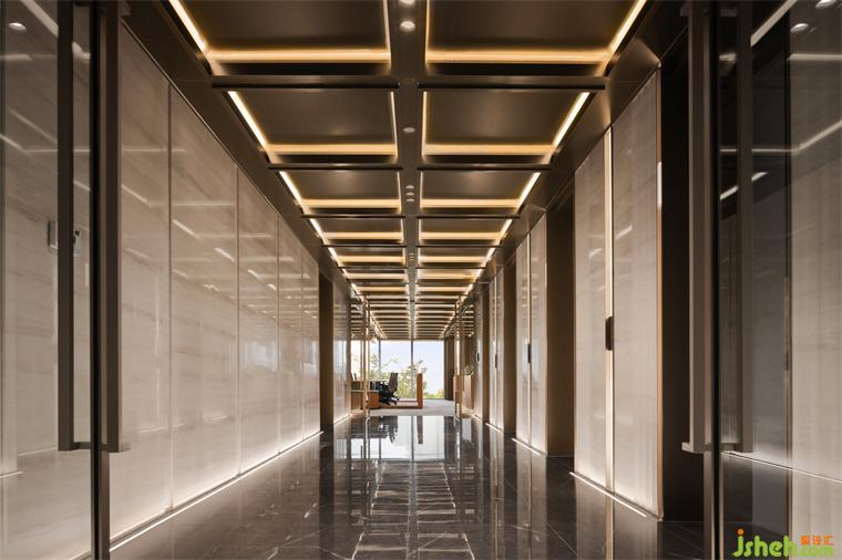 交易中心設(shè)計過道兩側(cè)采用白色透明的玻璃隔斷墻進一步保證了空間的通透性,灰色地毯沿著通道延伸,提供舒適的行走體驗外,轉(zhuǎn)向石材裝飾又強化了個別空間的私密性,整體深淺的色調(diào)變化在視覺上強化了空間功能區(qū)的層次轉(zhuǎn)變,形成邏輯清晰、層級分明的辦公場所。