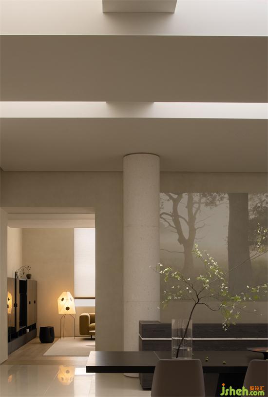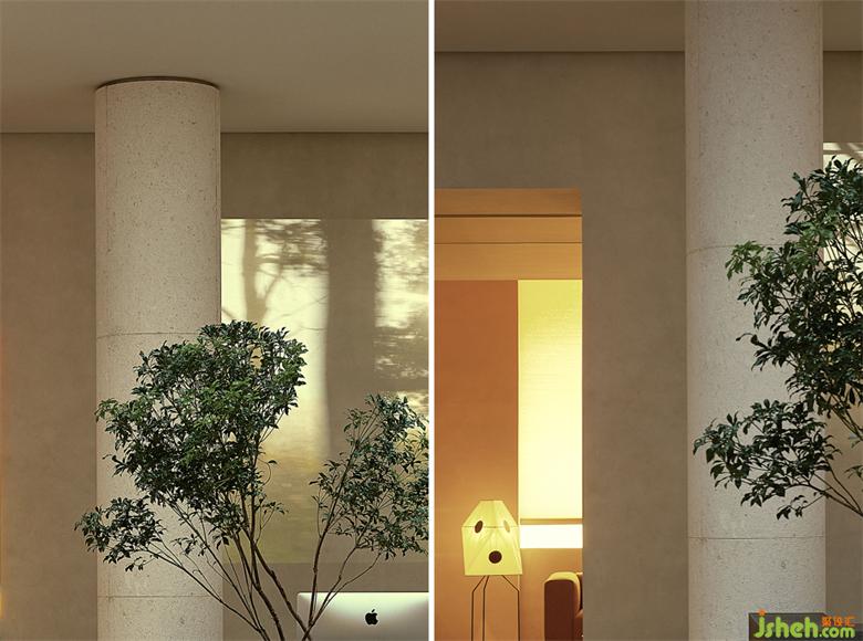 中間區(qū)域利用天花的層高,設置了中庭院落,頂部模擬了自然的天光。店鋪設計自然光進入街景的位置布置了起居。