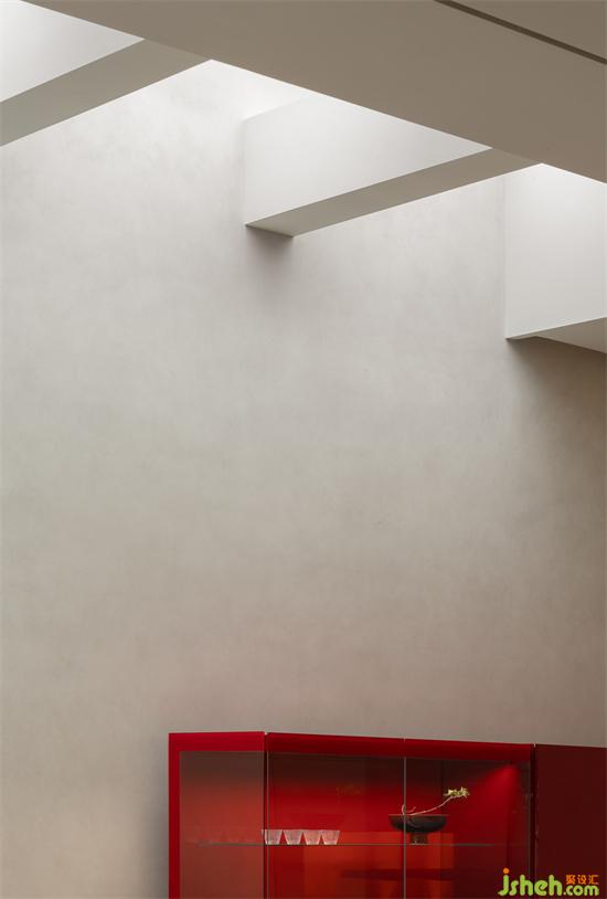 內(nèi)部的每個區(qū)域用多扇的門彼此連接。從入口的廊道進(jìn)入內(nèi)部的空間,依次經(jīng)過前區(qū)開放的區(qū)域和封邊的區(qū)域,廊道的墻壁使用天然的石材。天花被壓低,有種被邀請的和期待的情緒。