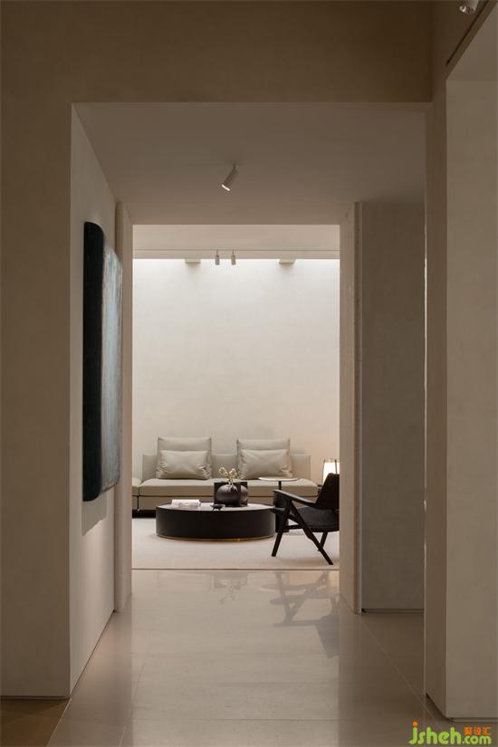 書房區(qū)的進(jìn)入給整體的空間帶來私密的感受,大扇木門的開啟,為進(jìn)入內(nèi)部空間和廊道的空間從視野上延展了深度和高度。