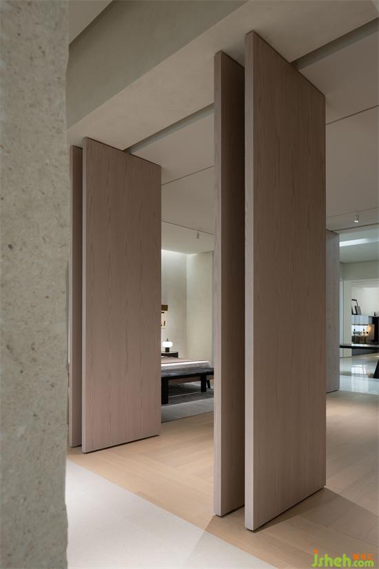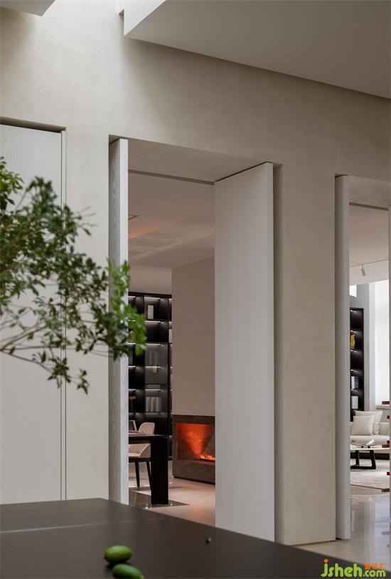 在角落的位置放置了一根自然石柱,將天與地縱向連接的同時(shí),橫向的空間開始變得流動(dòng)起來,真是神奇的依靠,就像在草原上的人們總是會(huì)找到巖石或者樹木休息與依靠作為庇護(hù)。