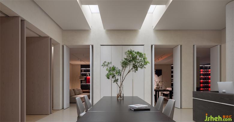 中心的院落庭院將作為整個(gè)項(xiàng)目的核心,連接內(nèi)部的空間,在方正的空間內(nèi)部利用場(chǎng)地的高度,模擬了頂部的天窗進(jìn)入的陽(yáng)光,光的顏色變化,可以體會(huì)從清晨到傍晚光線所營(yíng)造的情緒氛圍。