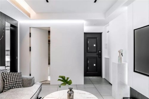 沙發(fā)背景墻中間的內(nèi)凹造型設(shè)計采用了質(zhì)感的黑鋼材質(zhì),與灰色的主色調(diào)形成鮮明對比。兩側(cè)則是設(shè)計了通頂?shù)碾[形柜體,巧妙地與整個空間的護墻木板融為一體,既滿足了業(yè)主的收納需要,更成為空間的點睛之筆。隱形門的設(shè)計,在視覺上切斷了內(nèi)外兩個世界的聯(lián)系,室內(nèi)設(shè)計師使客廳整體造型統(tǒng)一的同時,也保證了內(nèi)部空間的私密和舒適自在。