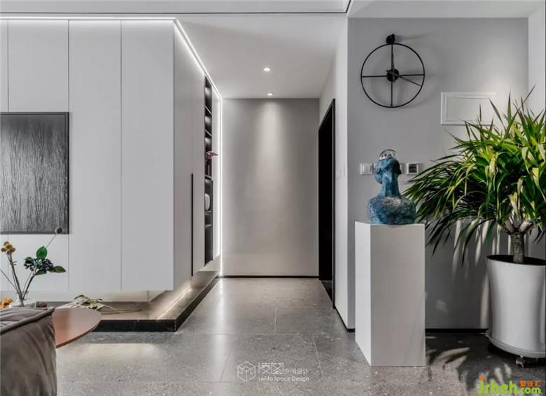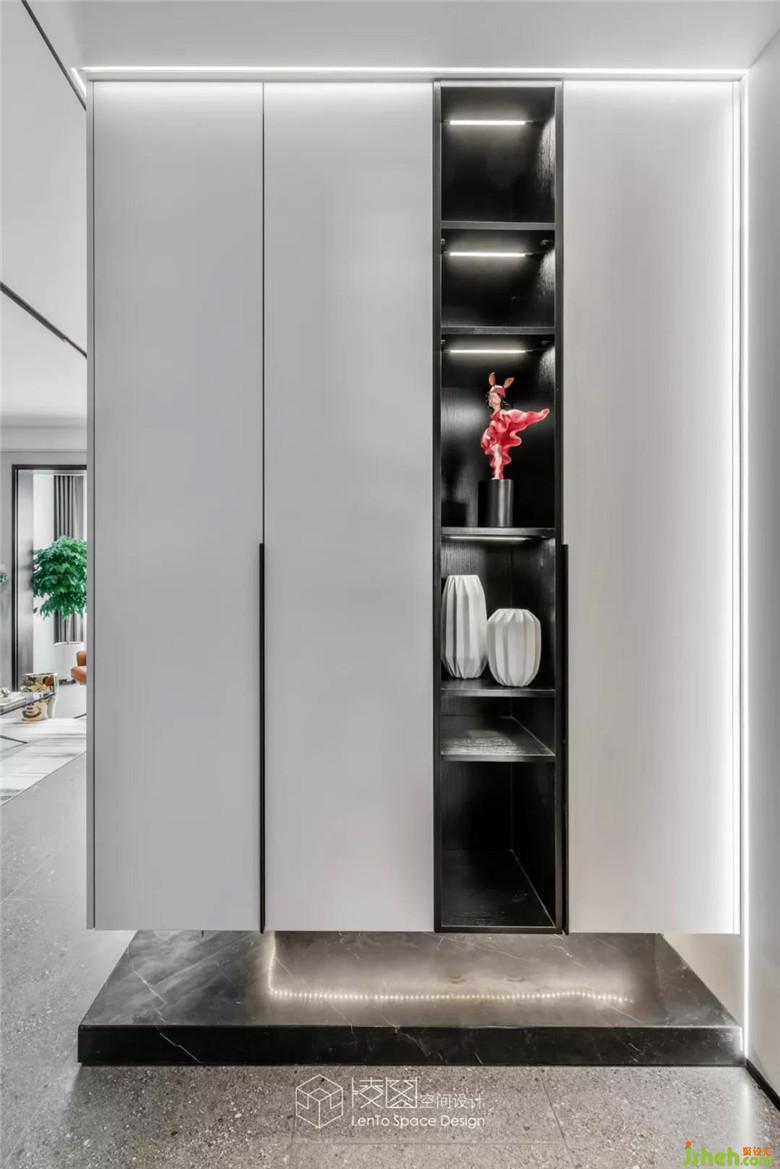 入戶白色定制柜,將鞋帽衣物等雜物巧妙地隱藏起來,配合簡單利落的黑色陳設架和若隱若現(xiàn)的輔助燈光,營造出溫馨與淡雅的視覺感受,將美觀與實用融為一體。