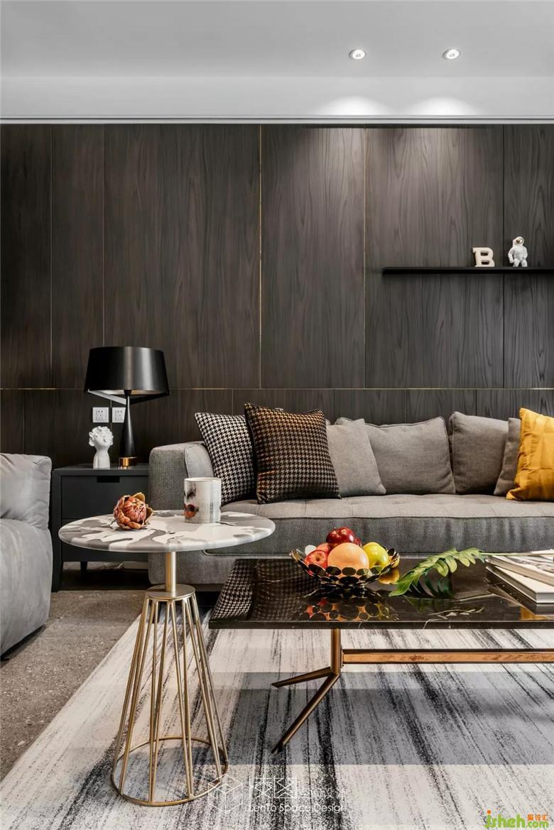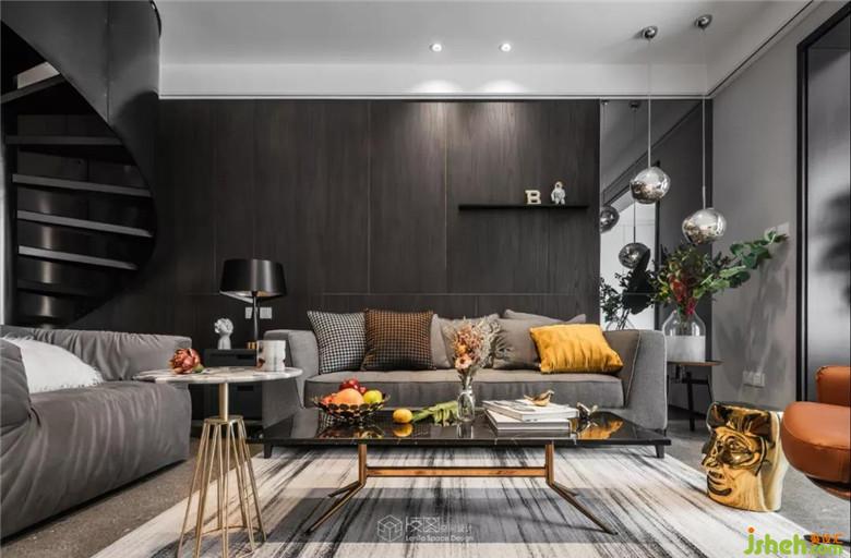 客廳一組灰色的布藝沙發(fā),與整體色調相呼應,L型的區(qū)域造型可以容納家中多人的休息,沙發(fā)上精心搭配色彩質地不一的靠墊,室內設計師使得這個空間更加的多姿多彩。