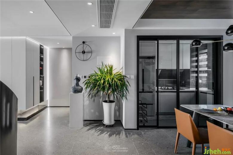 廚房通過黑色與淺灰色進(jìn)行搭配,室內(nèi)設(shè)計(jì)師利用合理空間定制出豐富的柜體,將廚房用具及雜物妥當(dāng)收納。黑框玻璃移門,使得這一空間在或封閉式或開放式兩者之間自由切換,給人以簡潔利落且通透立體的視覺效果。