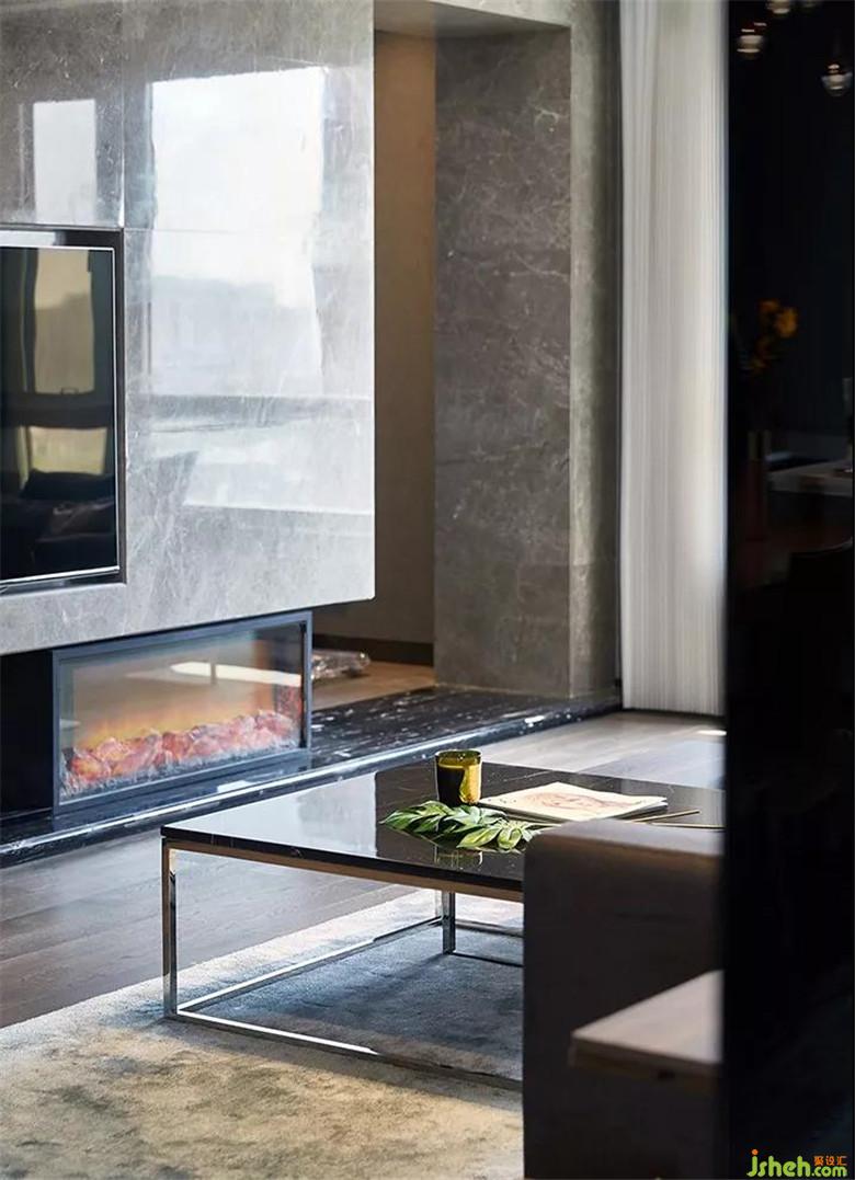 ▲電視背景墻采用了原始紋理的石材鋪設(shè),其中又匠心獨(dú)特地嵌入了一組壁爐,幾塊隨意堆砌的木柴。原本大氣硬朗的一隅,更添了幾分火熱的溫情。