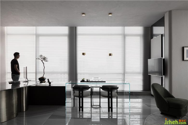 總經(jīng)理辦公室營造的是一個簡約輕奢又帶有淡淡中式文化底蘊的空間,掛畫、大班臺石材臺面、花瓶、地磚等表面波浪紋理形成了一種水墨流淌的氣息,橢圓的大班臺和圓形的茶幾讓空間更為柔和親切,超白玻璃茶臺搭配簡約的原石茶具,還有造型精致的德國原裝進口OCCHIO小吊燈,讓整個空間顯得干凈而且統(tǒng)一,隨著百葉狀香格里窗簾除除升起,窗外開闊的景觀躍然眼前,置身其中,有一種忘卻浮世繁華的寧靜。