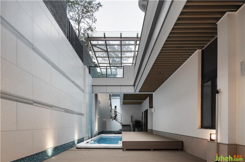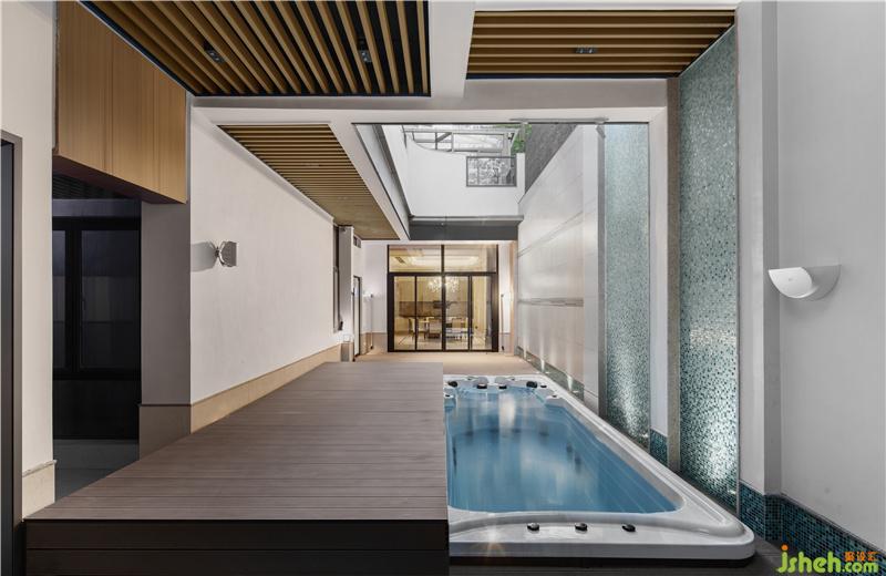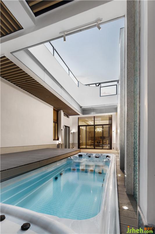 負一層為游泳區(qū)域。在這里,設(shè)計師將中空位置設(shè)置在泳池上方,在游泳時亦可感受到陽光與空氣。泳池側(cè)的漸變馬賽克造型墻則營造出流水意境,與泳池形成了良好的互動,浸泡在泳池中仿佛置身大自然的瀑布下戲水。而弧形線條的中空造型,則打破了生硬,柔和了空間。泳池為一體式無邊際設(shè)計,具備帶趟蓋及可保溫功能,無論夏天、冬日均可恒溫暢泳。不使用時,可關(guān)上趟蓋,既可保溫又可防止小孩跌落,蓋面也可作為活動平臺使用。