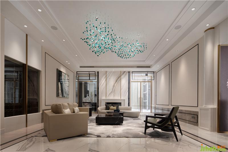 在會客廳的設(shè)計中,設(shè)計師運用了中式與歐式相結(jié)合的設(shè)計元素,以現(xiàn)代簡化的手法呈現(xiàn)于空間中。如沙發(fā)后的背景墻取意了古時大宅壓背的傳統(tǒng)屏風(fēng)造型,簡化為薄板石材元素,簡約而大氣。墻身的方形線框同樣為中西框線符號簡化而來,并與墻身的造型墻裙形成了呼應(yīng),精致而不失奢華。
