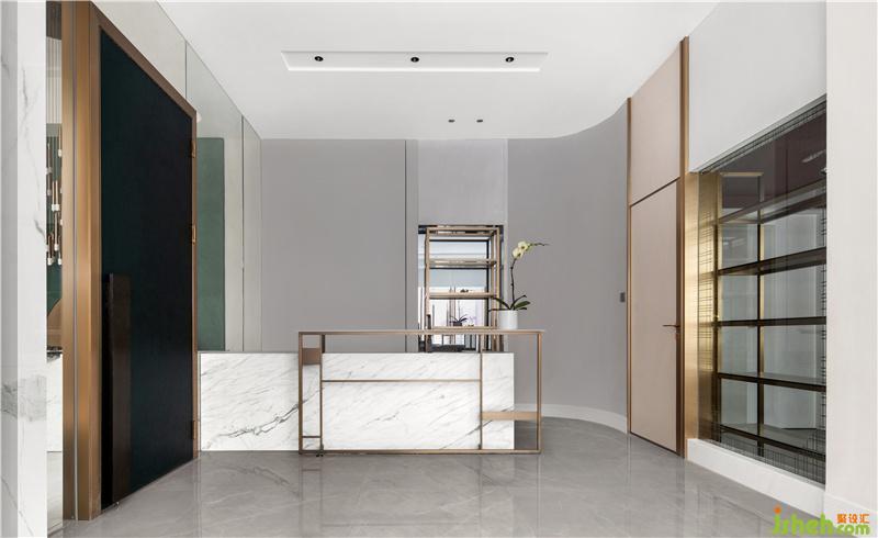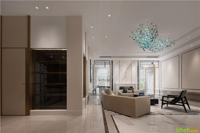 由泳池區(qū)域進入室內(nèi),是主人家接待客人以及親朋好友娛樂休閑頻率較高的場所,并與男主人的專屬茶室及書房空間相連,整體的設(shè)計風(fēng)格偏向于男主人喜好的簡中輕奢風(fēng)格,同時融入女主人喜好的歐式元素。