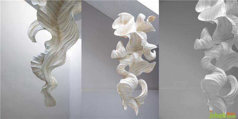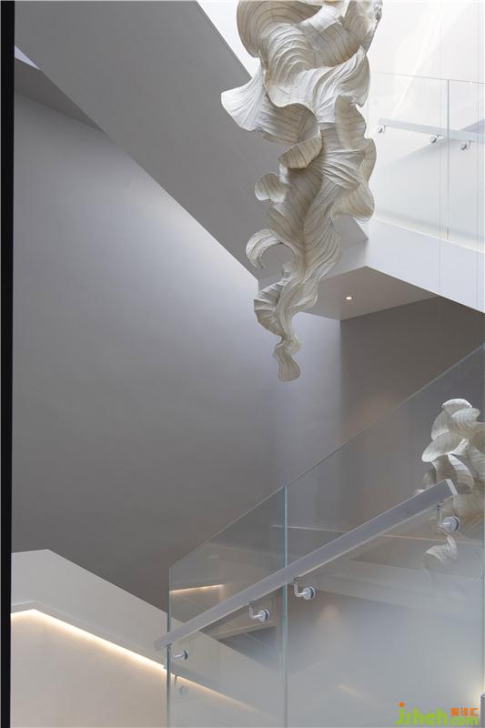 梯底暗喻水面的黑色玻璃地面,更襯托出梯級的立體感,中空手工紙?jiān)拿耖g藝術(shù)裝置,如朵朵浮云,飄于空間之上,呼應(yīng)著陽光盡頭魚躍江面的黑色藝術(shù)裝置,讓水與云的元素隨陽光無縫融入空間。拾級而上,心情也隨之闊然開朗!佛山會(huì)所設(shè)計(jì)