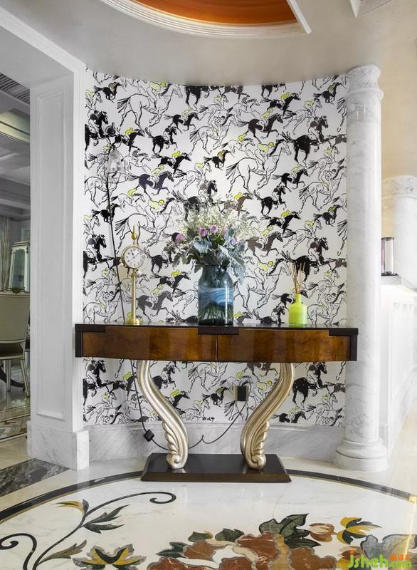 主要材料:爵士白大理石、白色飾面板、實(shí)木地板、大理石拼花、瓦帕茵特(Valpaint)藝術(shù)漆、愛馬仕墻布、SAINT LOUIS水晶燈、石匠花者
