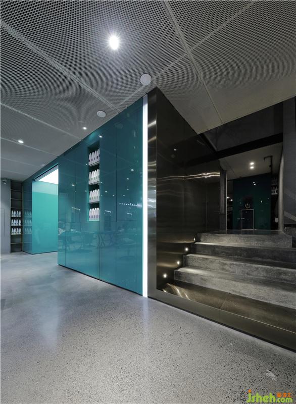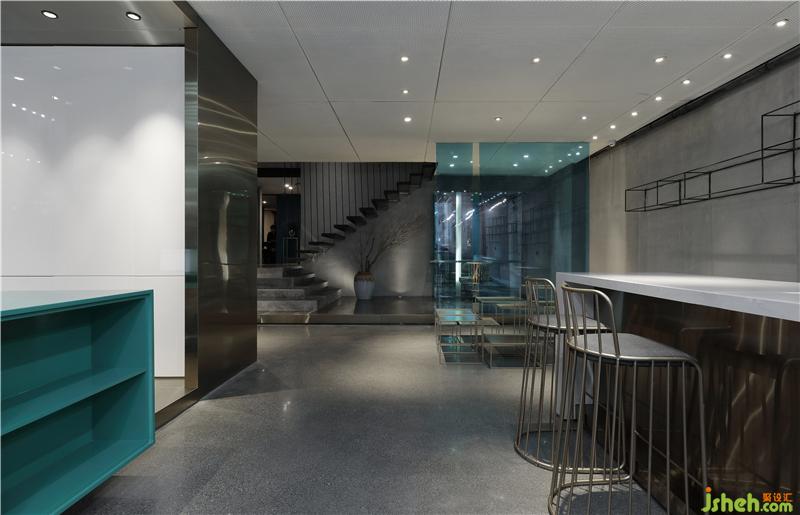 歌劇舞臺(tái)概念的貴賓區(qū),用一個(gè)強(qiáng)烈的L型金屬體塊劃分出來,粗獷的水泥臺(tái)階、黑色的鋼吊工業(yè)樓梯、淳樸的樹枝陶瓶裝飾、通透的蒂芙尼藍(lán)玻璃隔斷,組合在一起,頗有舞臺(tái)場景的畫面感。與之相鄰的蒂芙尼藍(lán)盒子中間用一條光帶切割出空間的界限,獨(dú)立又極富雕塑感。而在美發(fā)區(qū)又回歸到原始淳樸的空間感覺,目的是為了讓專業(yè)回歸本源,安靜的專心做一個(gè)屬于自己的發(fā)型。裝修設(shè)計(jì)