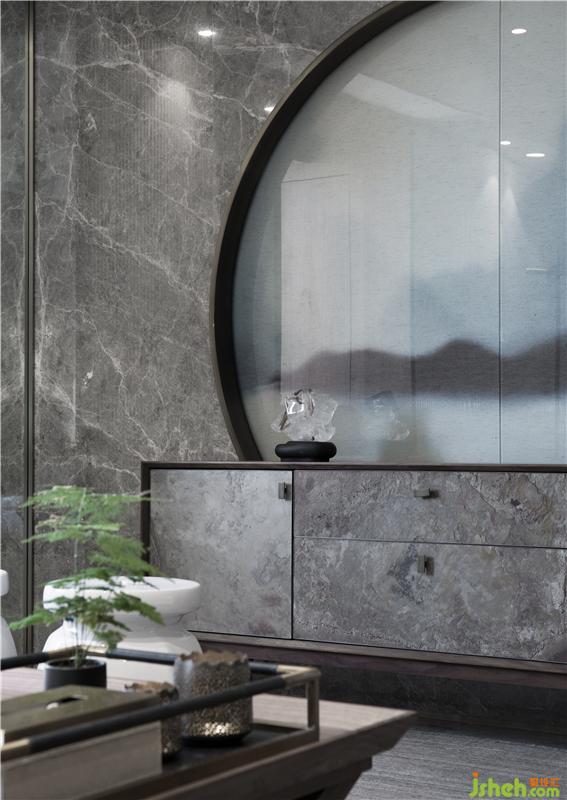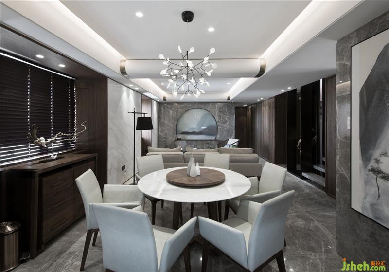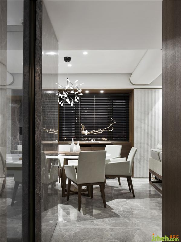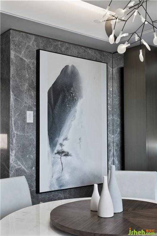 客餐廳的梁位過低,為了避免視覺及生活空間過于擁擠,采用了“畫軸”的設(shè)計手法,把客餐廳的天棚連成一幅畫卷,天棚上的燈具像墨點一樣繪在潔白的畫面上,即流露出中式的韻味,又完美的解決了構(gòu)造梁過低的問題;爵士白大理石的墻面采用半圓形的加工工藝,把大理石的自然紋理質(zhì)感像水墨畫一般的呈現(xiàn)出來。室內(nèi)設(shè)計師