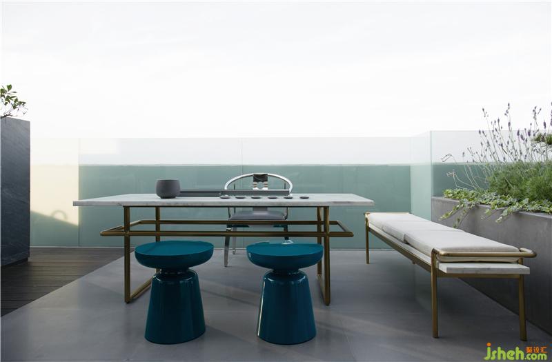 踏上懸空而輕盈的樓梯,迎面而來的是戶外茶室,為了讓視野更加純粹和安逸,四周的欄桿用磨砂玻璃加高,即保護了隱私,又把天空以外的東西給遮擋掉;泡上一壺清茶,沒有世間物的繁雜,讓心情更加豁達。室內設計師