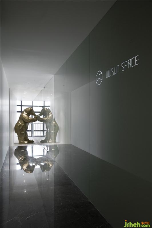 一道光門,隔開了外界的紛擾,拾階而上,映入眼簾的是一頭金色的熊趴在玻璃上向內(nèi)窺望,這是致敬藝術(shù)家Lawrence Argent在美國Denver Convertion Center創(chuàng)作的藍(lán)熊,它的趣味性打破了走廊的單調(diào)。辦公室設(shè)計(jì)