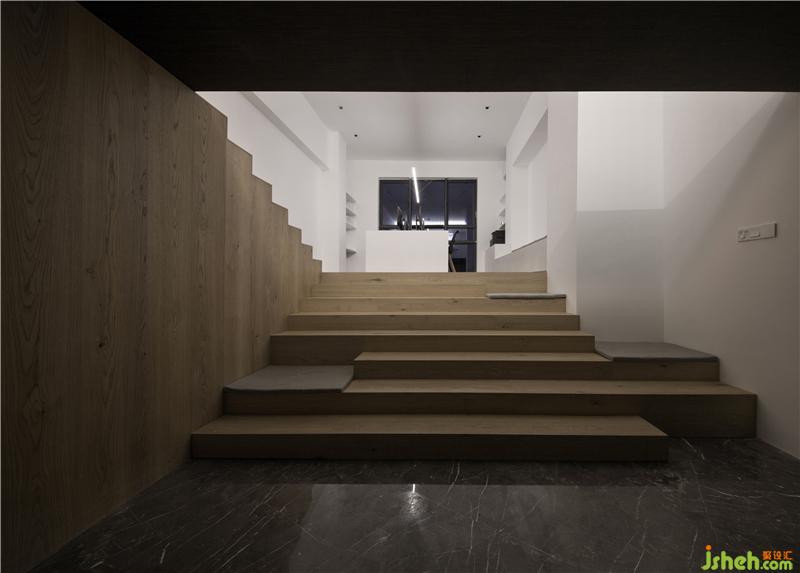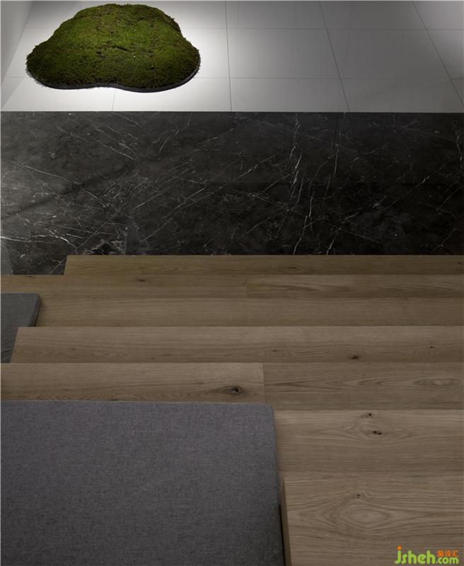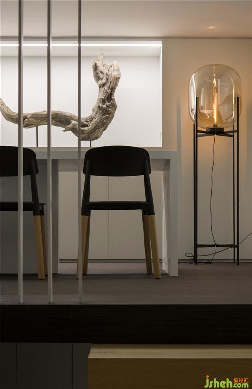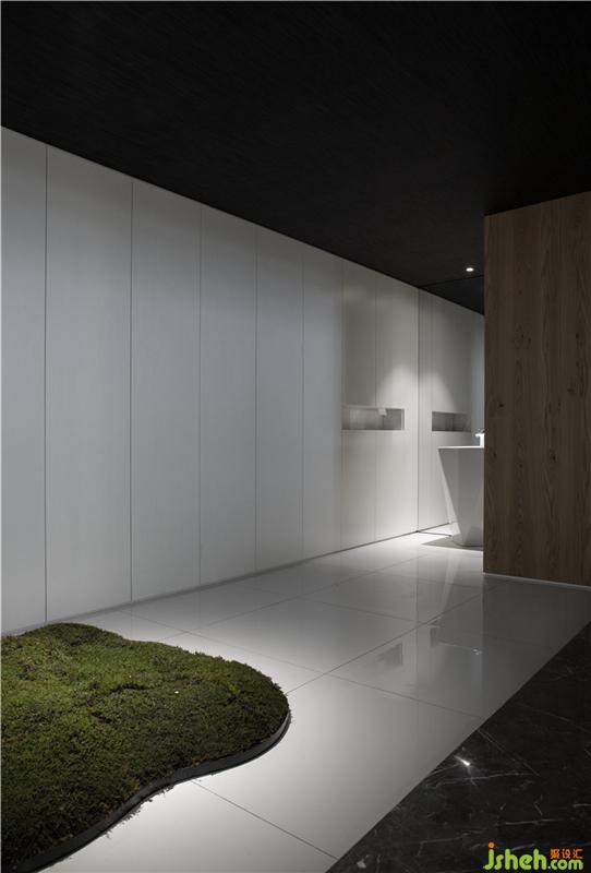 走廊的兩條光線分別指引著兩個(gè)不同區(qū)域的入口,右邊的玻璃墻隱藏著工作室的LOGO,不開燈的時(shí)候,這是一堵干凈的玻璃墻,絲毫看不出有什么特別;灰色的大理石地面像紐帶一樣,連接著兩個(gè)不一樣的空間。
