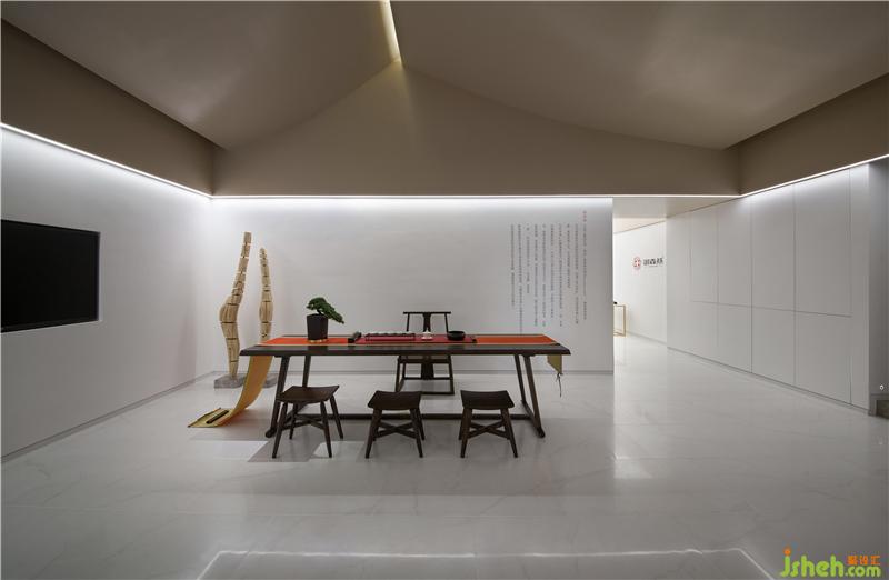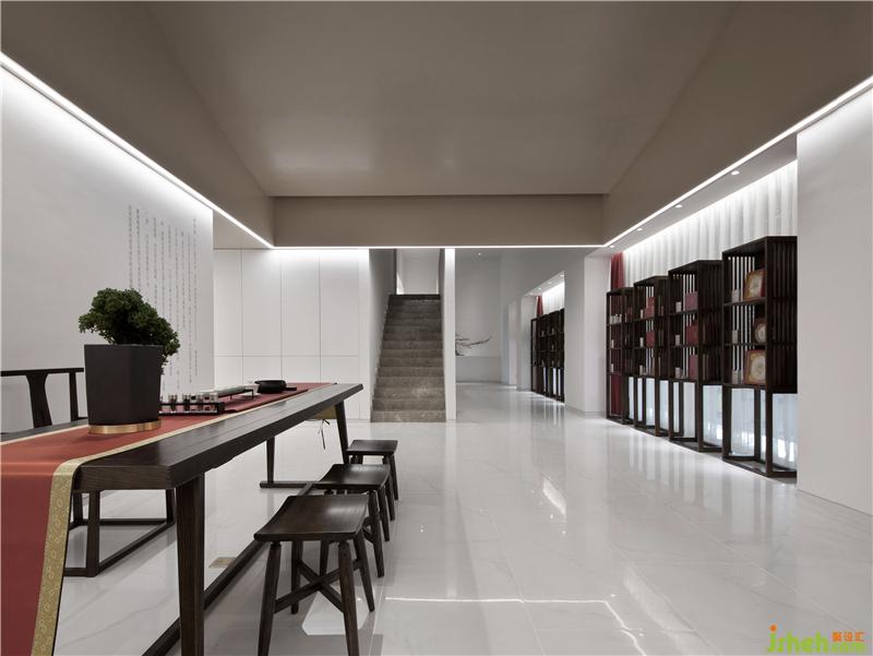 而入口對面的形象墻,我們也摒棄了傳統(tǒng)品牌形象墻的表現(xiàn)方式,以表達(dá)品牌文化為主要的呈現(xiàn)手法,前面擺放中式茶桌,加強(qiáng)品牌的親和力。裝修設(shè)計
