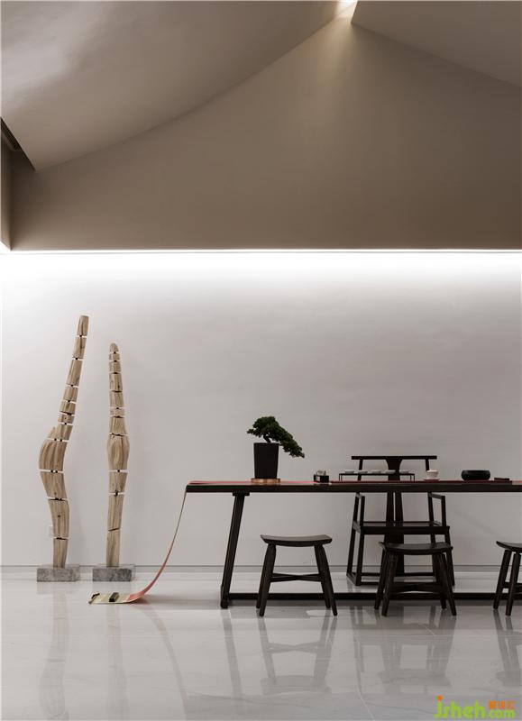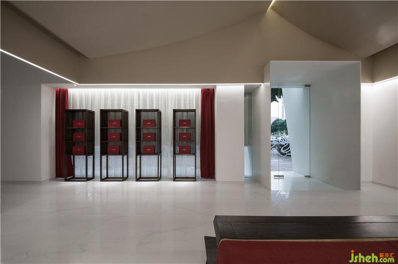 通過一個白色的長方形盒子,我們進(jìn)入了內(nèi)部空間,整個大堂空間讓人覺得空靈又溫暖,天棚由兩片弧形組成,有著似曾相識的感覺;這是由民居屋頂演化過來的,用現(xiàn)代的表達(dá)方式來呈現(xiàn)文化記憶,而天棚顏色則是兒時記憶的屋頂瓦片顏色所提取的。裝修設(shè)計