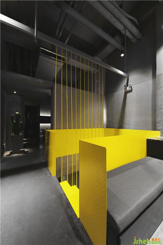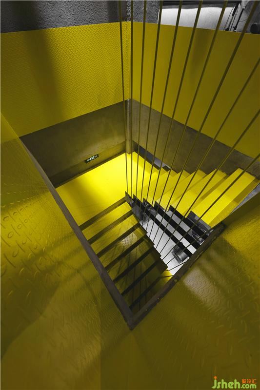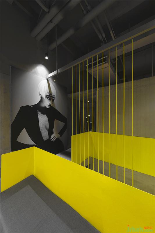 由外往內(nèi)一望,巨大的黃色樓梯裝置如雕塑般躍然于空間之中,強(qiáng)烈的視覺沖擊力營造出新都市時(shí)尚感,油然而生的想法:這是一個(gè)很酷的美發(fā)空間。裝修設(shè)計(jì)